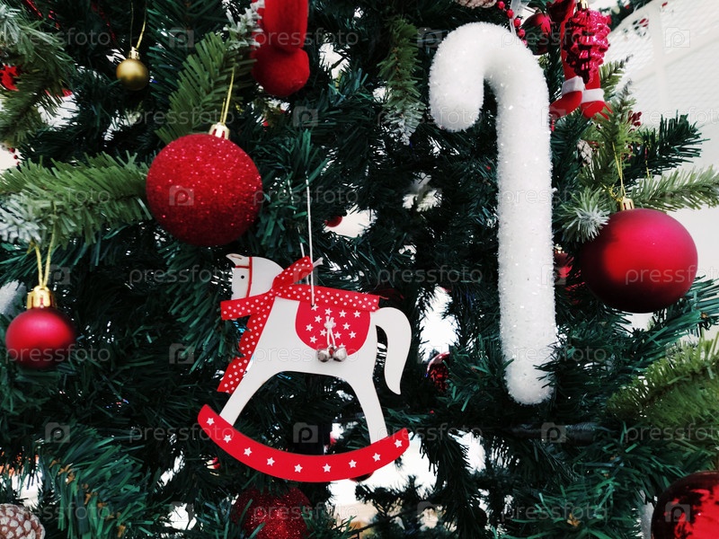 Рождественская елка с украшениями, елочными шарами и игрушками. Красные и белые висячие украшения. Красивые шарики, яркие ягодки и шишки. Палочка из снежных конфет. Игрушка - лошадка-качалка