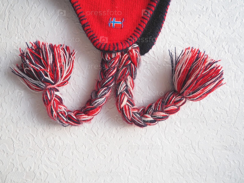 Кепка-ушанка в норвежском стиле. Вязаный модный предмет с завязками и кисточками с помпонами. Красная пряжа с черными и белыми нитками. Пришит мини-флаг Норвегии. Сувенирная зимняя шапка