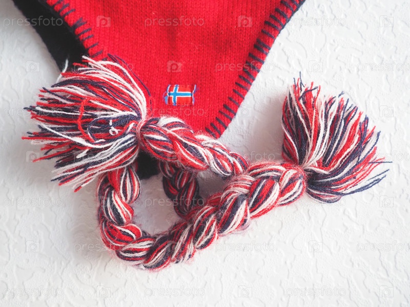 Кепка-ушанка в норвежском стиле. Вязаный модный предмет с завязками и кисточками с помпонами. Красная пряжа с черными и белыми нитками. Пришит мини-флаг Норвегии. Сувенирная зимняя шапка