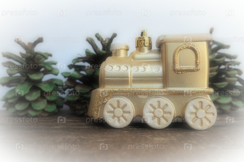 Золотой детский игрушечный поезд. Шишки расписаны зеленой гуашью Елочки. Новогодняя или рождественская открытка. Сосульки и снег в поезде. Праздничный фон. Рождественские украшения. Белая виньетка