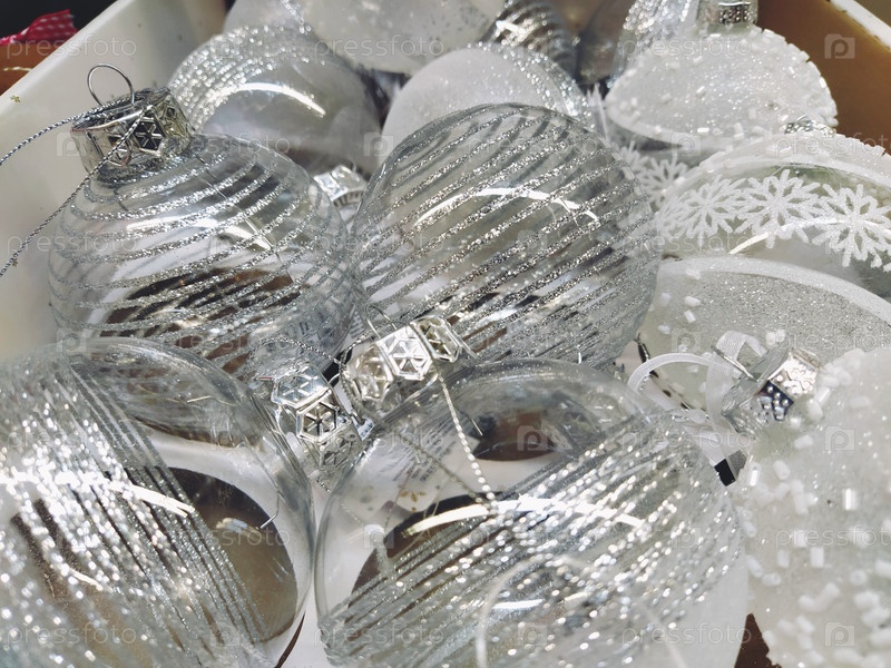 Большие прозрачные красивые елочные шары в коробке на полке в магазине. Продажа рождественских новогодних игрушек и украшений перед праздником. Стеклянные елочные украшения