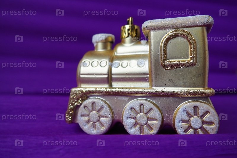 Золотой игрушечный поезд локомотив на фиолетовом и сиреневом градиентном фоне. Новогодняя или рождественская открытка. Сосульки и снег на поезде. Свободное место для текста. Скопируйте пространство. Праздничный фон