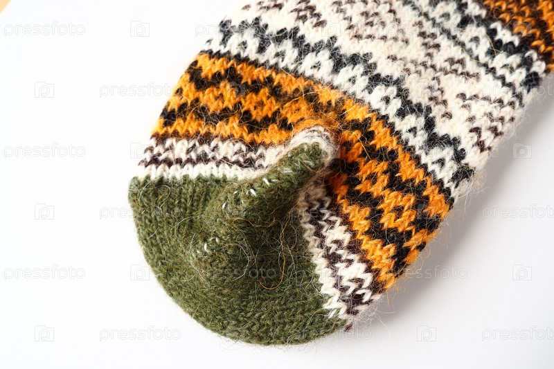 Фрагмент орнамента на вязаном шерстяном носке. Зимние мотивы. Бежевые, коричневые, белые, зеленые, черные нитки для ручного вязания узора. Вязаный передний пяточный шов ручной вязки. Белый фон
