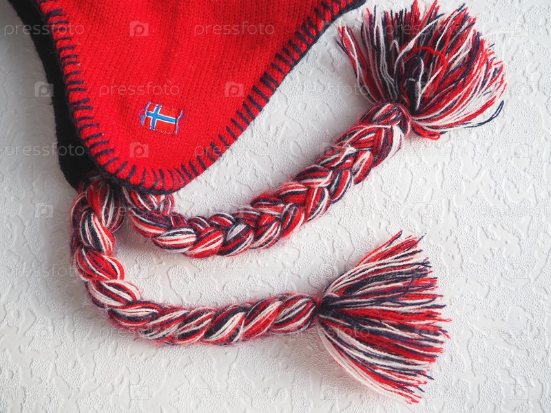 Кепка-ушанка в норвежском стиле. Вязаный модный предмет с завязками и кисточками с помпонами. Красная пряжа с черными и белыми нитками. Пришит мини-флаг Норвегии. Сувенирная зимняя шапка