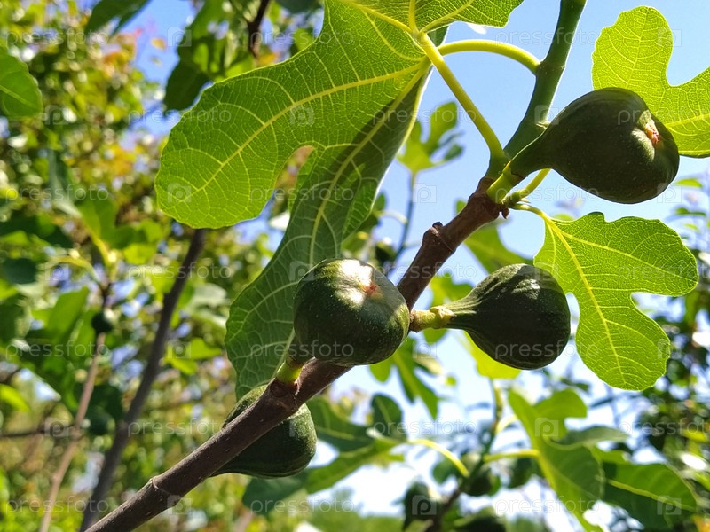 Инжир на ветке. Зеленые ветки смоковницы. Выращивание фруктов на фруктовом дереве. Голубое небо на заднем плане. Частично расфокусированное изображение. Крупный план