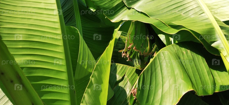 Банановые ветки и листья. Тропическая пальма. Солнечная погода. Текстура листьев Тропикана, природа большой пальмовой листвы и зеленый фон