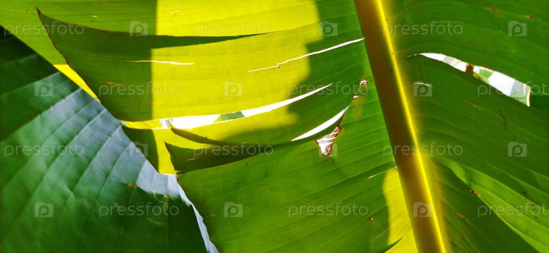 Банановые ветки и листья. Тропическая пальма. Солнечная погода. Текстура листьев Тропикана, природа большой пальмовой листвы и зеленый фон
