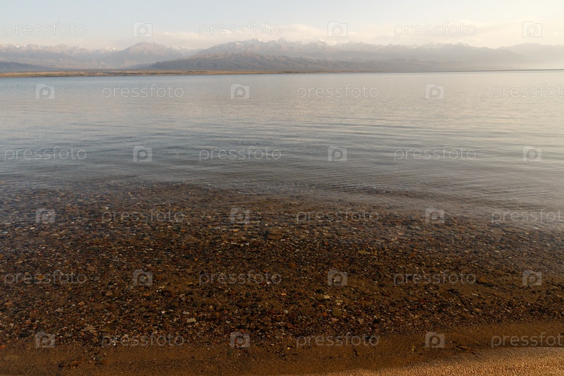 Прозрачная вода на озере Иссык-Куль в Кыргызстане, камни на дне озера
