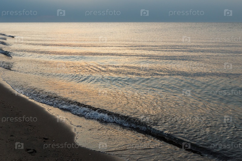 Озеро Иссык-Куль. Кыргызстан. Песчаный берег и волны на озере в сумерках. Вечер на озере