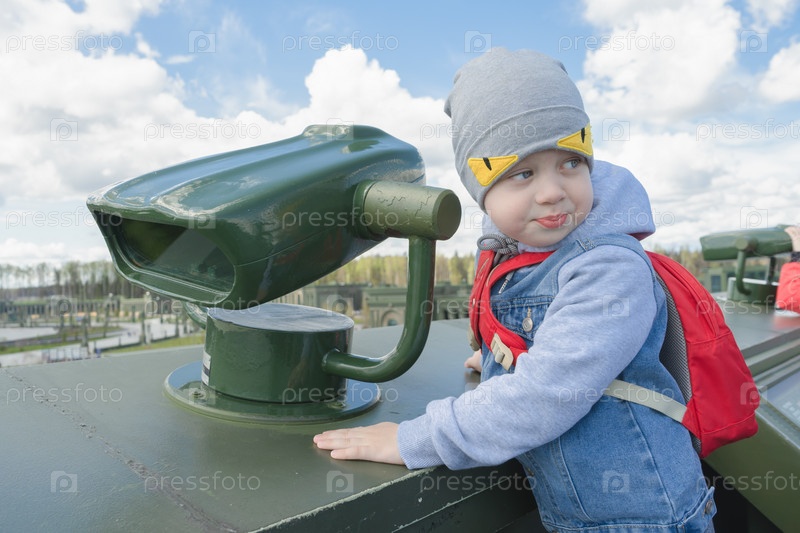 Стационарный бинокль на смотровой площадке. Мальчик использует стационарный бинокль