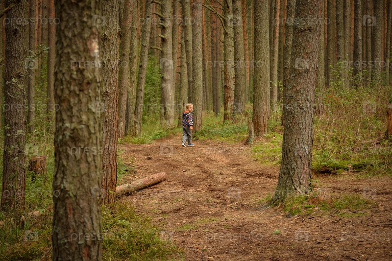 Ребенок в хвойном лесу, сосновый лес, ребенок среди стволов деревьев в лесу
