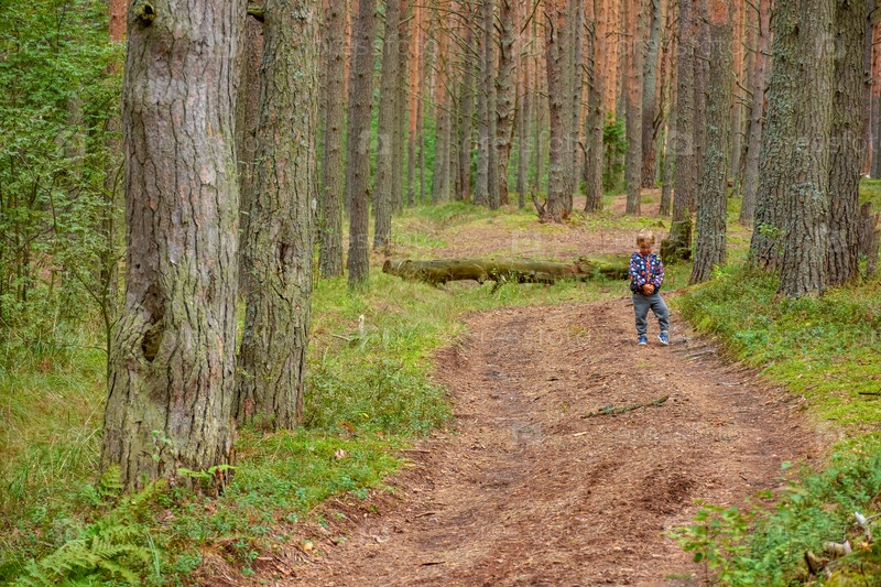 Ребенок в хвойном лесу, сосновый лес, ребенок среди стволов деревьев в лесу
