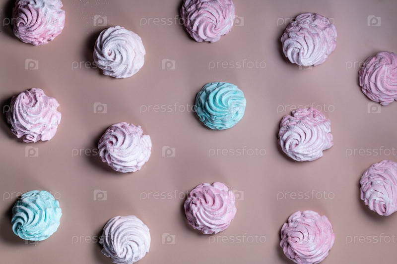 Разноцветные, розовые, голубые, белые вкусные зефиры и безе крупным планом, вид сверху, плоская планировка, узор