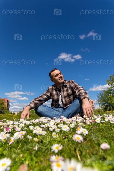 Молодой красавец сидит и веселится на солнечной цветочной поляне в солнечный день. Расслабленный молодой человек сидит в цветочном поле