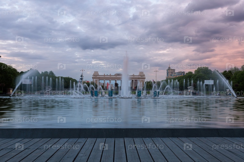 Фонтан в парке Горького на закате, Москва, Россия