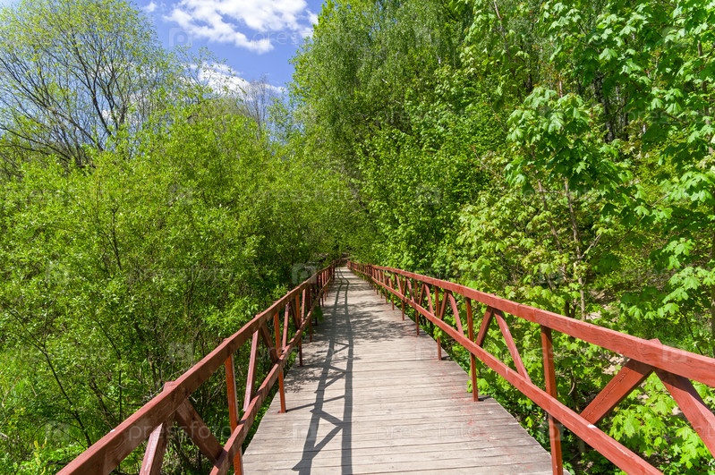 Деревянный пешеходный мостик, построенный над заболоченным дном оврага, по которому течет ручей. Теплостановский лесопарк, Москва, солнечный день в середине мая