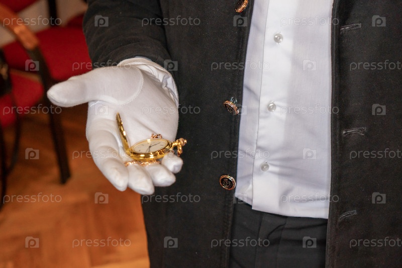 Мужчина в темном костюме и белых перчатках держит в руке карманные золотые часы