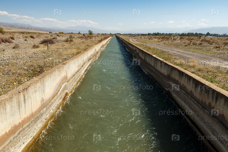 Оросительный канал Чуйской области. вода течет в оросительном канале в кыргызстане