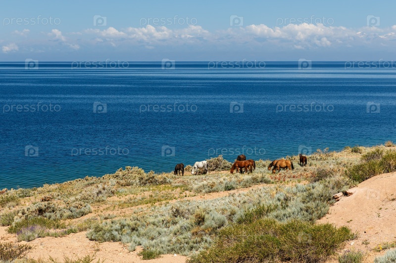 Табун лошадей на берегу озера Иссык-Куль, Кыргызстан