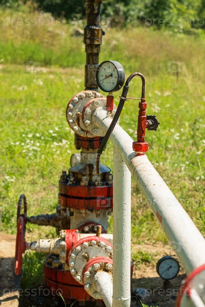 Манометры, клапаны и старые трубы, по которым перекачивается масло. На трубах ржавчина и следы нефтепродуктов. Грязная добыча черного золота из скважины. Загрязнение окружающей среды