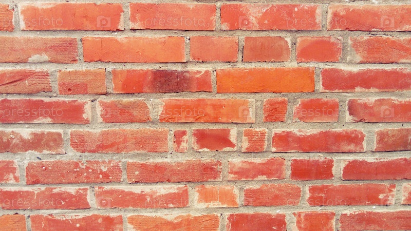 Кирпичная стена из ярко-красного кирпича. Слегка изношенная поверхность. Кладка аккуратная, между рядами цемент. Гранж-фон. Внешний вид здания. Интерьер комнаты. Облицовка фасада