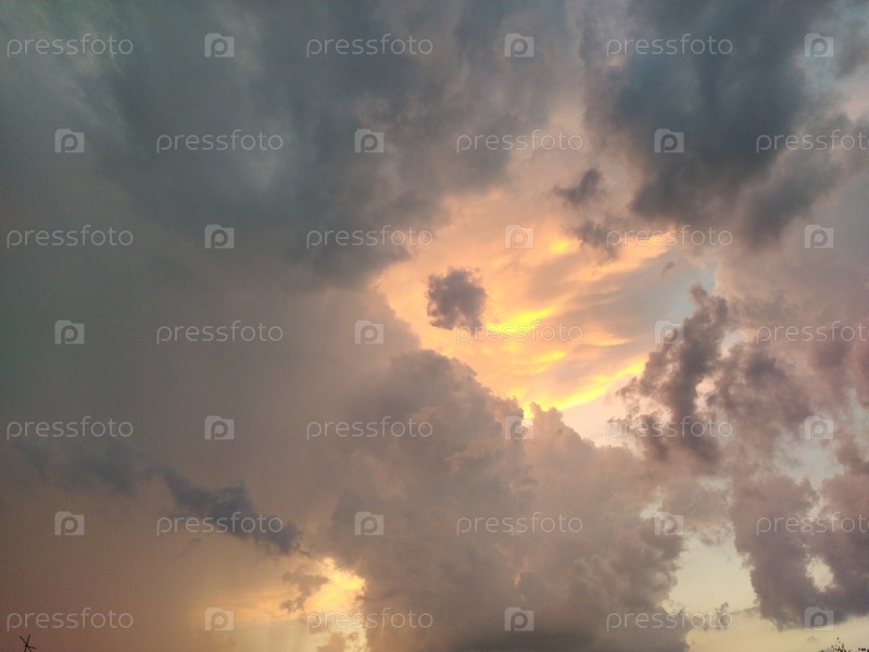 Драматические красивые грозовые тучи во время заката. Кучевые облака подсвечиваются оранжевым и розовым цветом. Темные и серые тона по бокам изображения. Баннер. Нежные пастельные тона