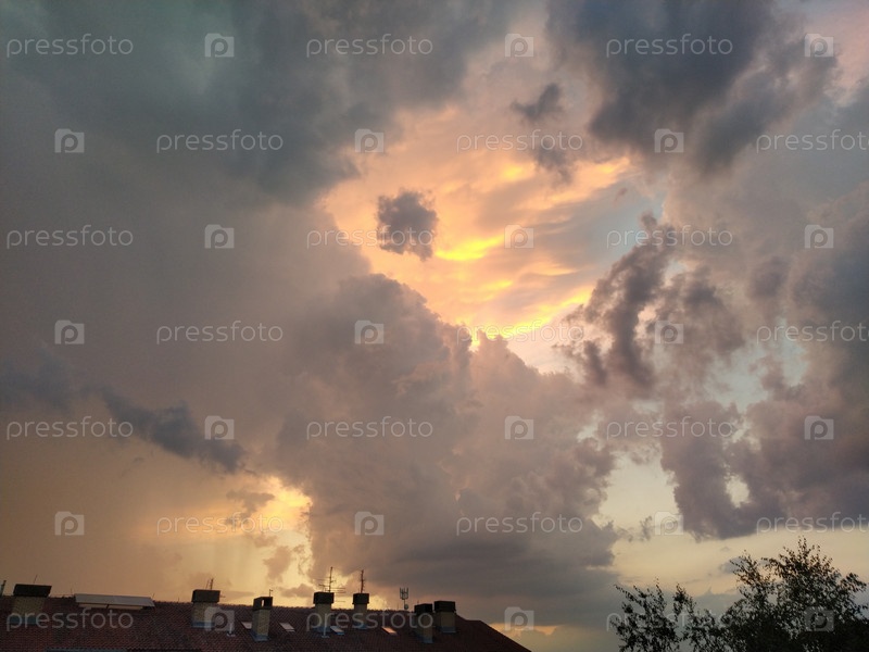 Красивые грозовые тучи во время заката над крышами. Кучевые облака подсвечиваются оранжевым и розовым цветом. Нежные пастельные тона неба