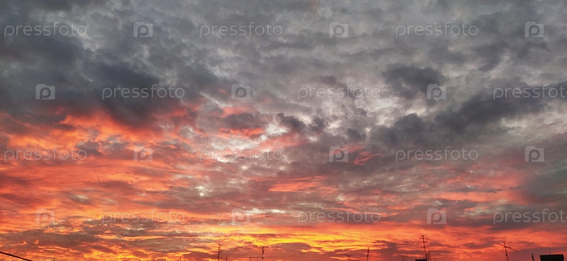 Драматические красивые облака во время заката. Кучевые облака подсвечиваются оранжевым и розовым цветом. Темные и серые тона. Баннер. Нежные пастельные тона