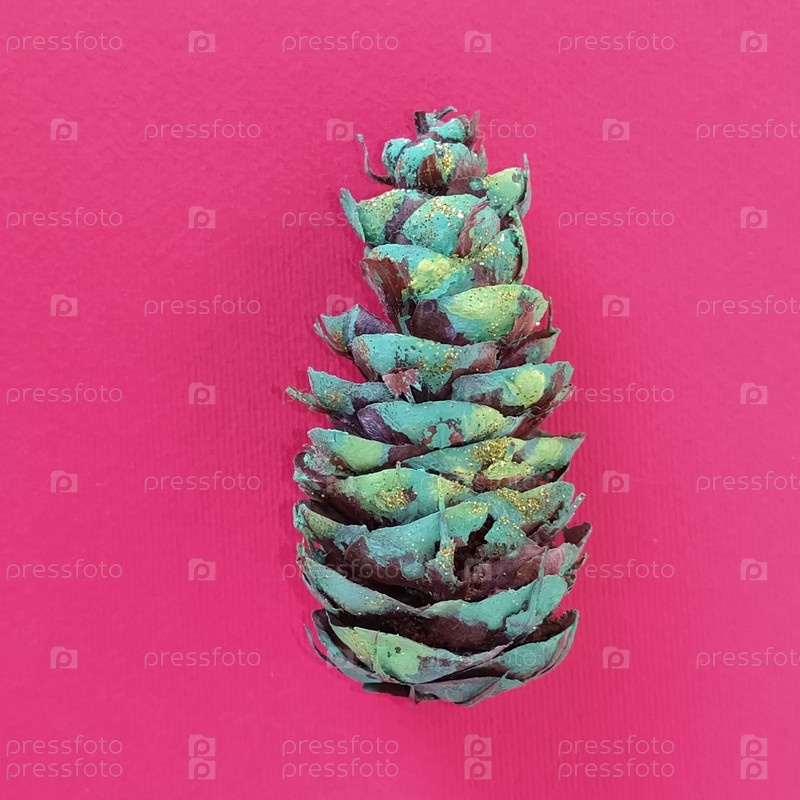 Красивая сосновая шишка зеленого цвета, украшенная золотыми блестками. На заднем плане светло-голубая ткань. Скопируйте пространство. Рождественский конус