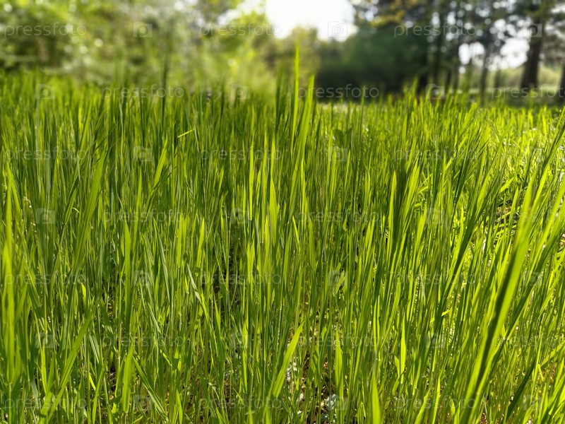 Зеленая предпосылка травы с лучом солнца. Пшеничное поле. Взошли посевы озимых культур. Весна или лето. Частично расфокусированное горизонтальное фото