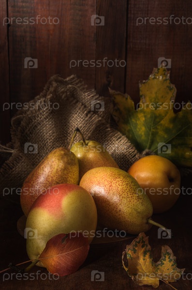 Спелые груши на темном деревянном фоне в деревенском стиле