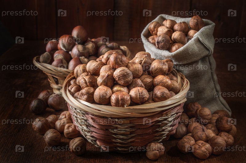 Фундук в корзине на темном деревянном фоне