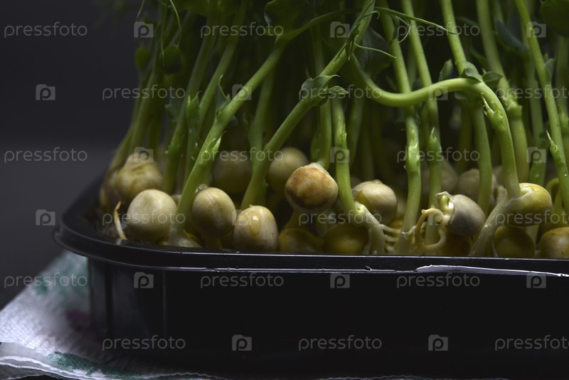 Проросший горох в лотке. Свежий зеленый салат из побегов гороха. Пророщенная зелень в салате