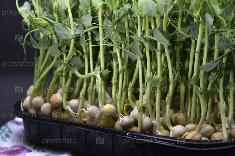 Проросший горох в лотке. Свежий зеленый салат из побегов гороха. Пророщенная зелень в салате