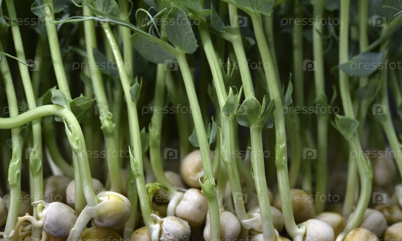 Проросший горох в лотке. Свежий зеленый салат из побегов гороха. Пророщенная зелень в салате
