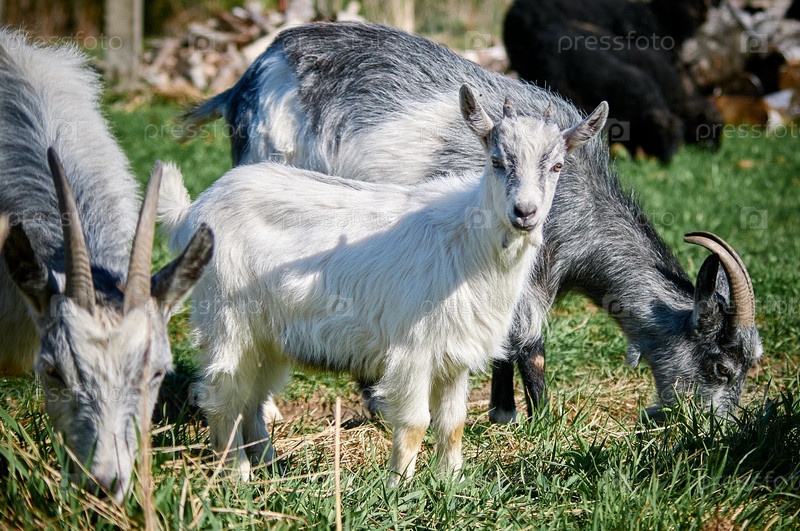 Стадо коз, белый козленок смотрит в камеру