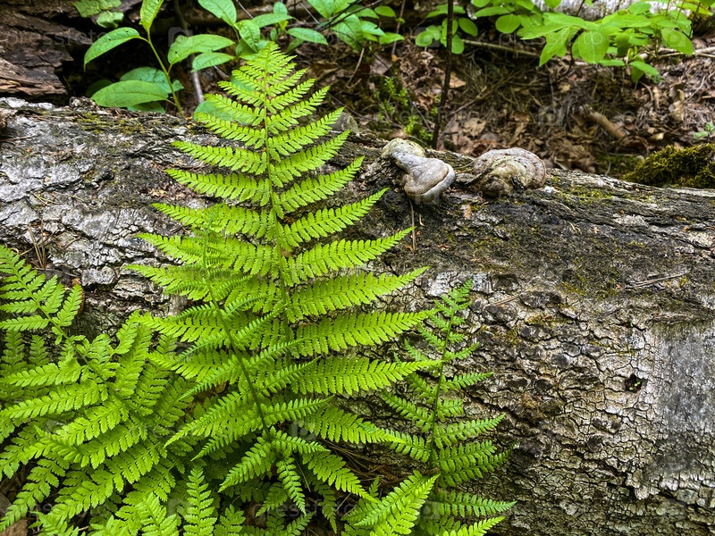 Папоротник на фоне коры дерева и грибы на дереве