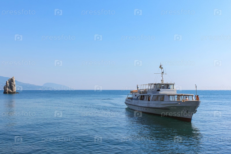 Прогулочный катер в спокойной голубой морской воде. Фон — голубое небо и горы. Красивый морской пейзаж. Экскурсионный туризм. Ялта, Крым
