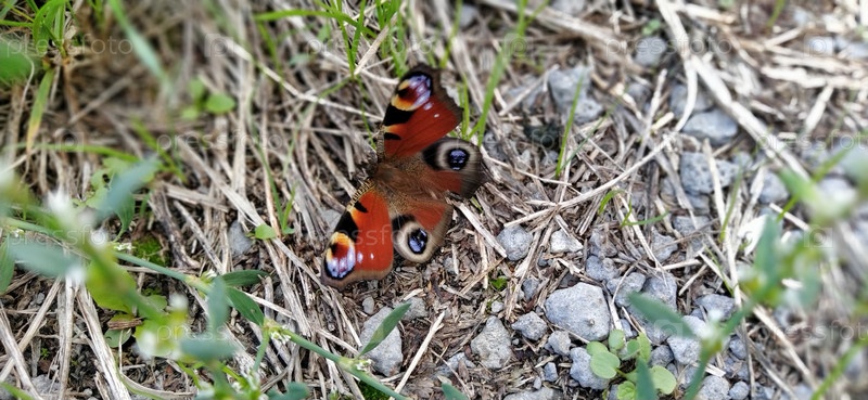 Бабочка - европейский павлин, Инахис ио сидит на камне, макро. Дневная бабочка семейства нимфалидов Nymphalidae. Крылья красно-коричневого цвета. На крыльях 4 больших глаза с голубыми пятнами