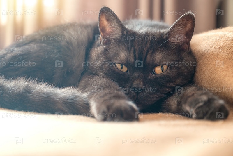 Симпатичная полосатая кошка отдыхает на кровати, покрытой теплым шерстяным пледом