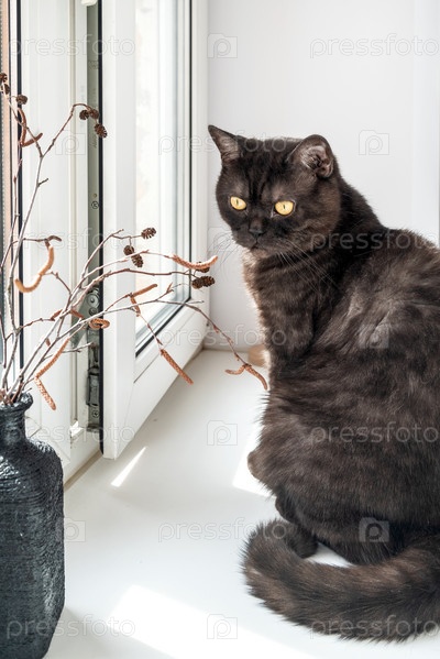 Серый полосатый кот сидит на подоконнике и греется на солнышке