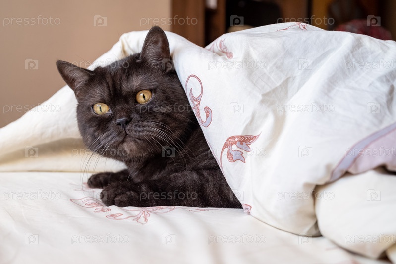 Смешной кот спит на кровати, выглядывая из-под одеяла