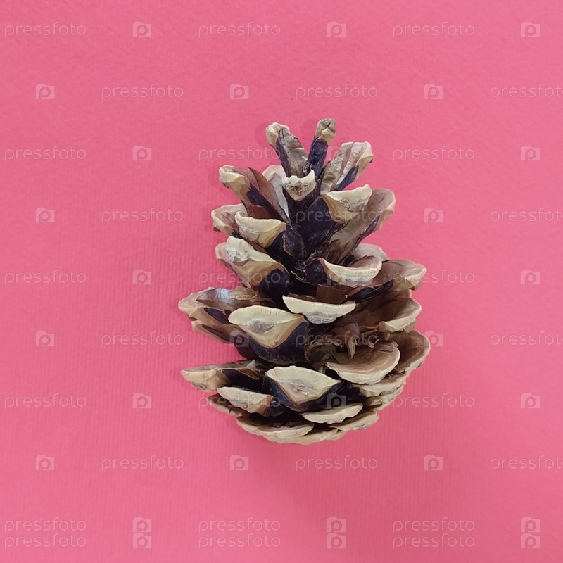Красивая шишка на красном фоне. Новогодние и рождественские украшения. Ель или сосновая шишка крупным планом. конус в середине изображения