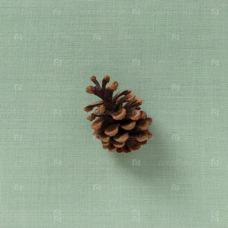 Сосновая или еловая шишка на зеленом фоне. Посередине кадра лежит коричневая выпуклость с небольшой тенью. На заднем плане светло-зеленая шерстяная ткань с видимым плетением