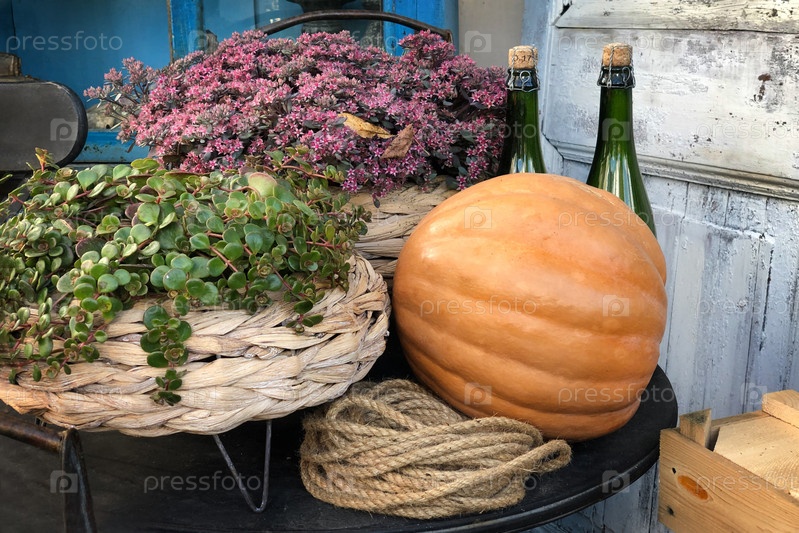 Осенний стол, оформленный в деревенском стиле с большой оранжевой тыквой и винными бутылками