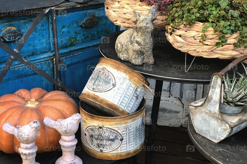 Декоративная керамика, винтажные коробки и маленькие тыквы на прилавке на осенней ярмарке