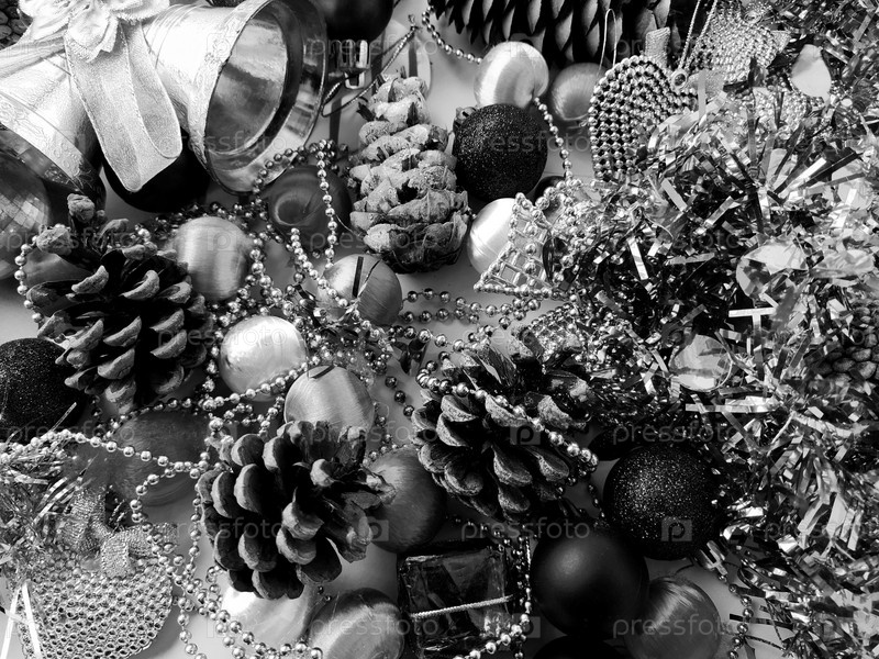 Коллекция рождественских украшений. Красиво расставленные блестящие яркие елочные игрушки, фольга и подарки. Элементы декора к Новому году и Рождеству. Черно-белая плоская планировка