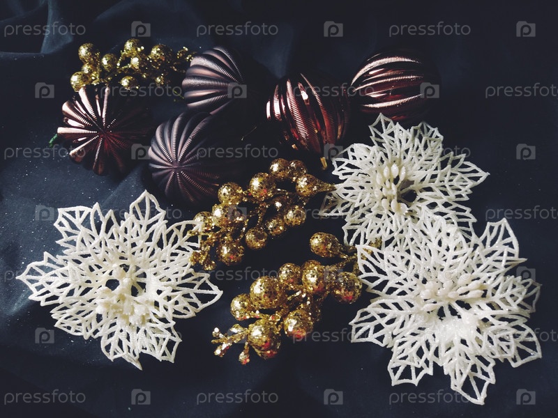 Открытка на новый год и рождество с украшениями, рождественскими украшениями и блестками на черном фоне. Коричневые блестящие полосатые шарики, цветы и белые снежинки, золотые веточки с ягодами