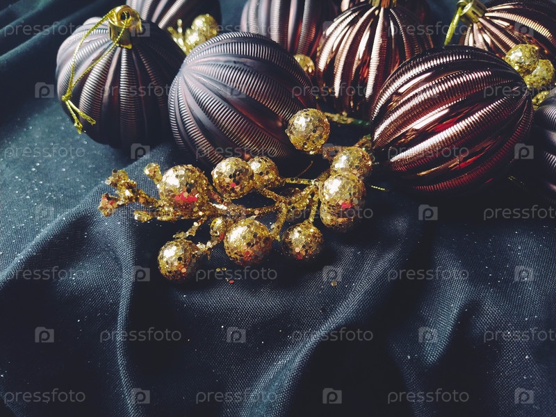 Открытка на новый год и рождество с украшениями, рождественскими украшениями и блестками на черном фоне. Коричневые блестящие полосатые шарики, цветы и белые снежинки, золотые веточки с ягодами