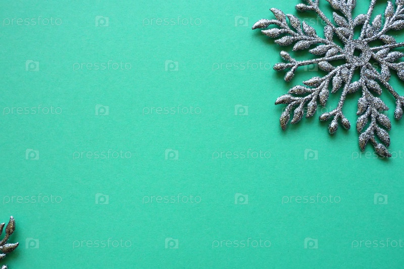 Новогодний или рождественский фон с декоративной снежинкой по краям листа цветной бумаги. Скопируйте пространство. Голубая серебряная снежинка на зеленом фоне. Открытка, фон или приглашение